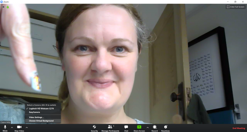 Step 2 – Click on the little arrow to the right of “Stop Video” and select “Choose Virtual Background”.